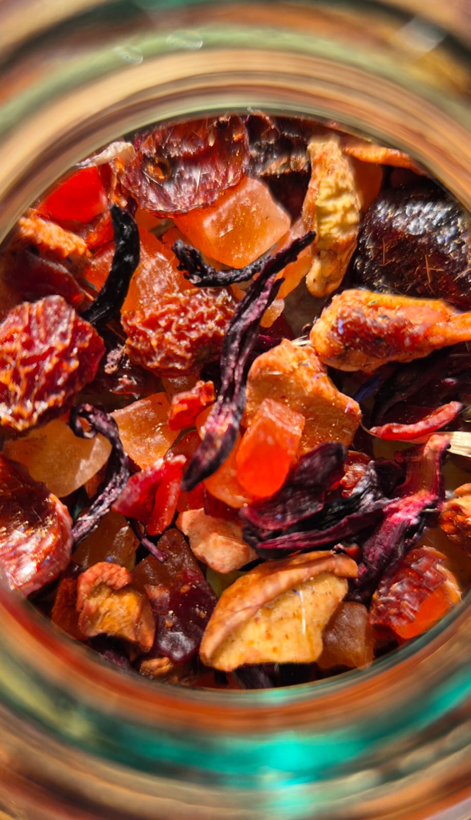 Composition : Morceaux de papaye, pomme, cynorrhodon, cranberry, fleurs d'hibiscus, pétales de bleuets, arômes.