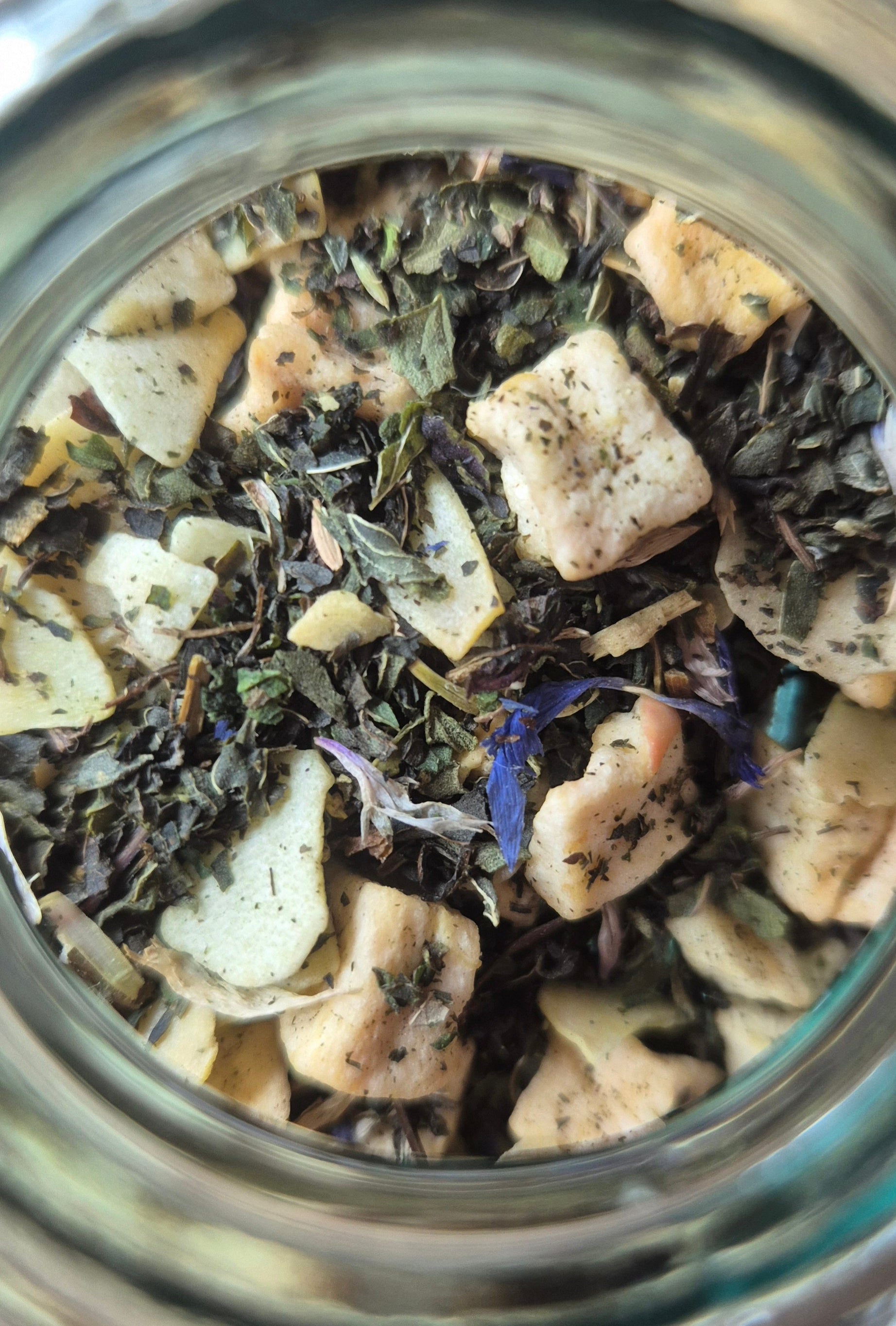 Composition : Chips de coco, cubes de pomme blanche, menthe poivrée bio, menthe nanah bio, menthe douce bio, fleures de bleuet bleu, HE menthe nanah
