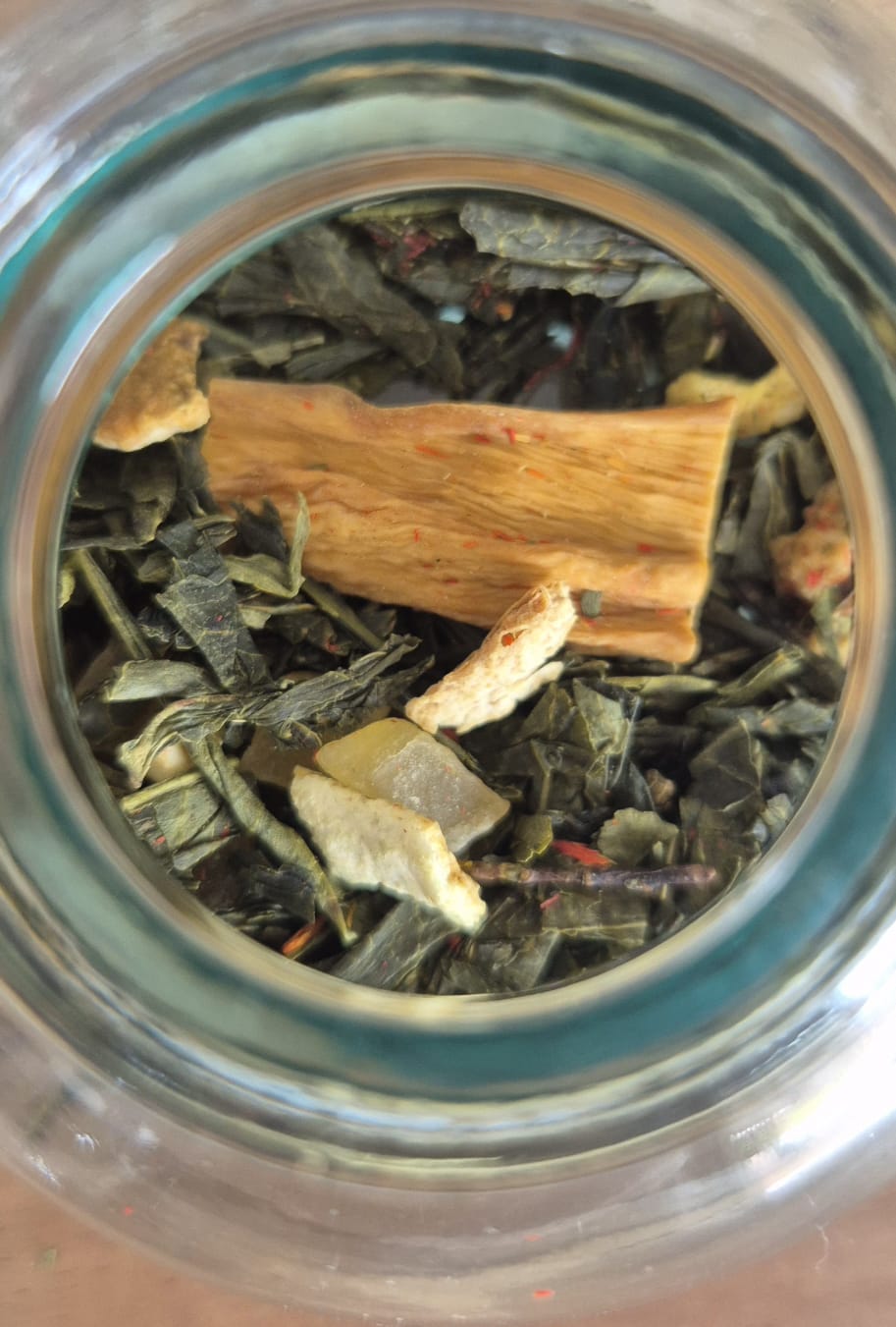 Composition : Thé vert, cubes de mangue, écorce d'orange, tranches de carambole, arômes, pétales de carthame.