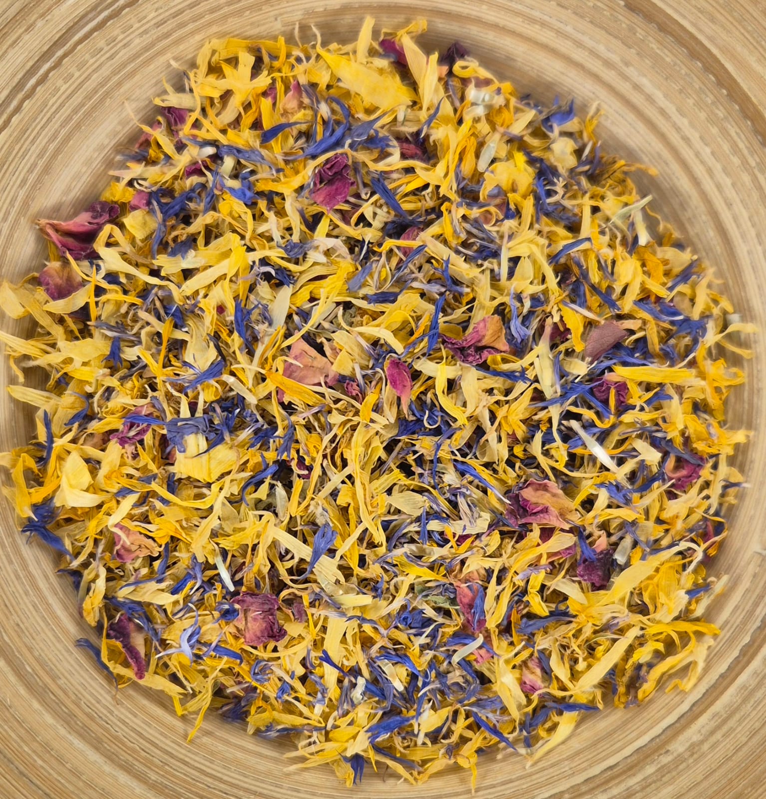 Un mélange de fleurs composé de pétales de bleuet, de souci et de rose, qui apportera de belles notes colorées et orientales pour sublimer vos salades, fromages et desserts.